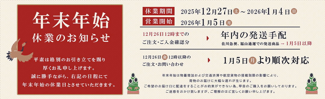 物量増加および交通渋滞や航空貨物の搭載制限の影響により、 荷物のお届けに大幅な遅れが生じております。 発送後、遅延事由によるキャンセルは承れません。 お時間に余裕をもってご注文をいただきますようお願いいたします。